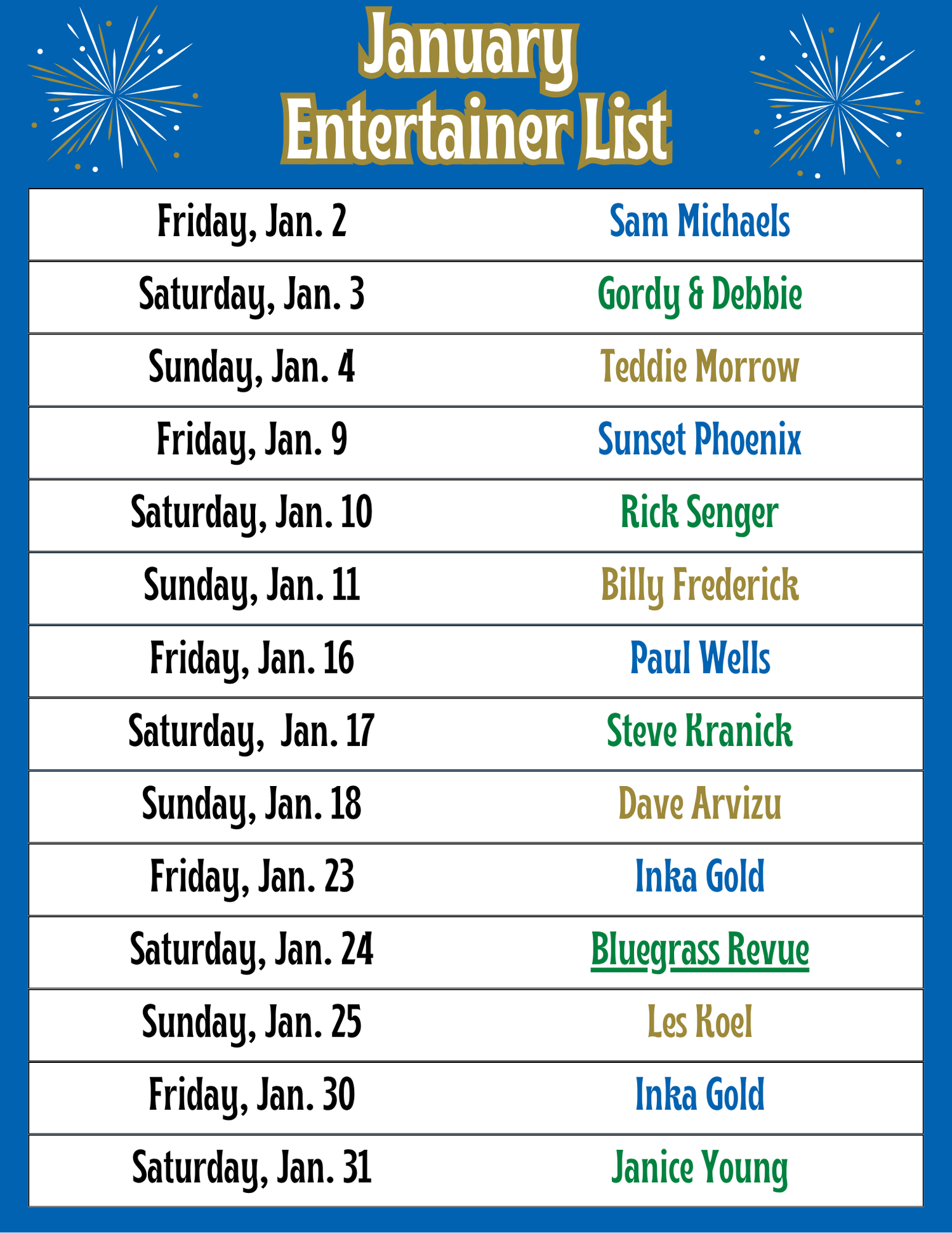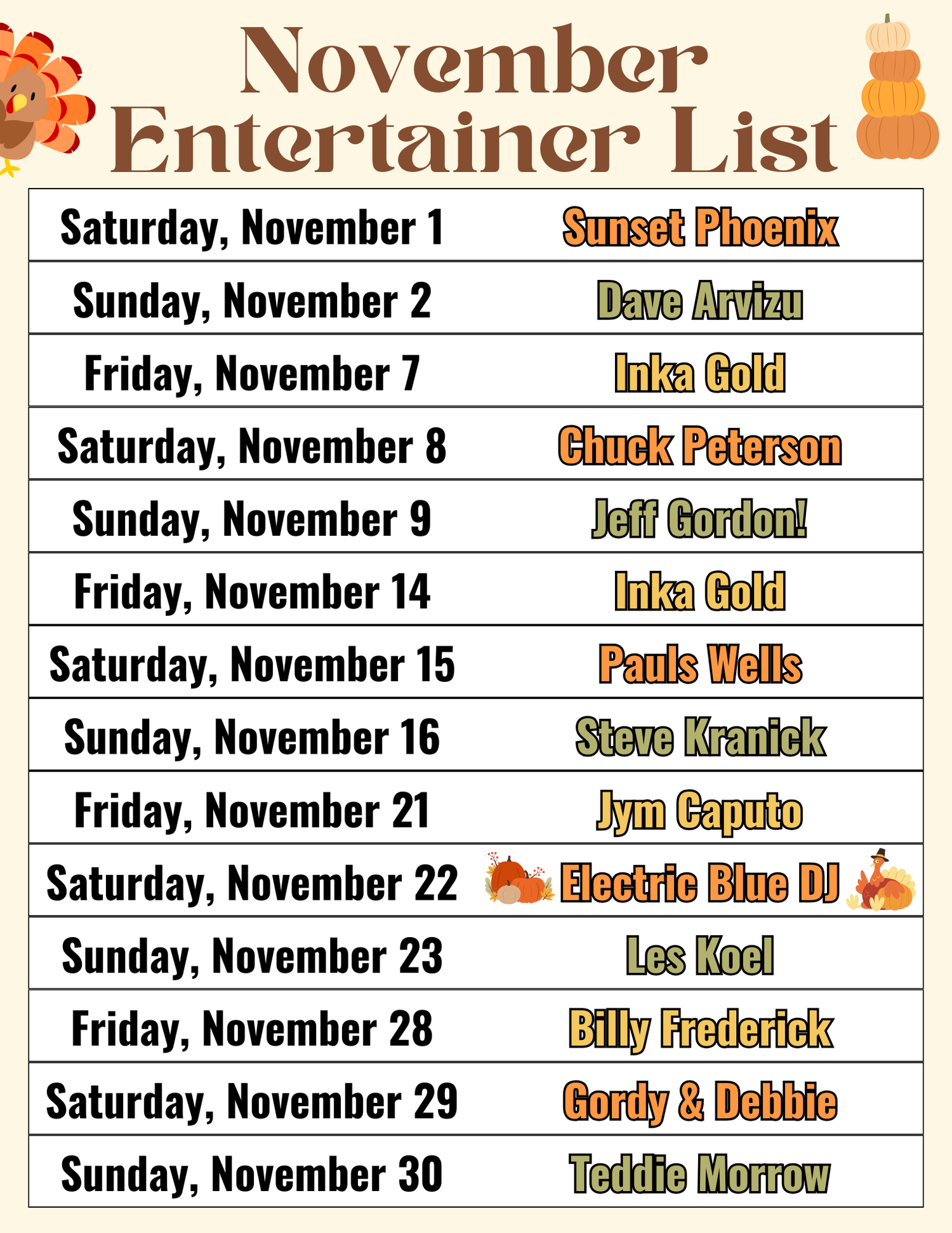Bring your family and friends to enjoy our wonderful lineup of entertainers! You can find our entertainers performing at our Restaurant in B-Row!
