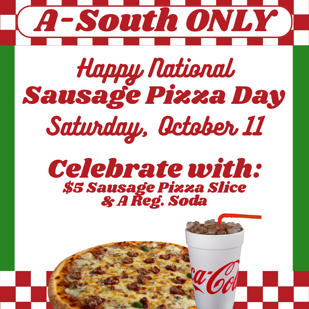 Join us on Saturday, October 11 to celebrate National Sausage Pizza Day with a $5 Slice & a Soda Special! This will be in our A-South Snack Bar ONLY
