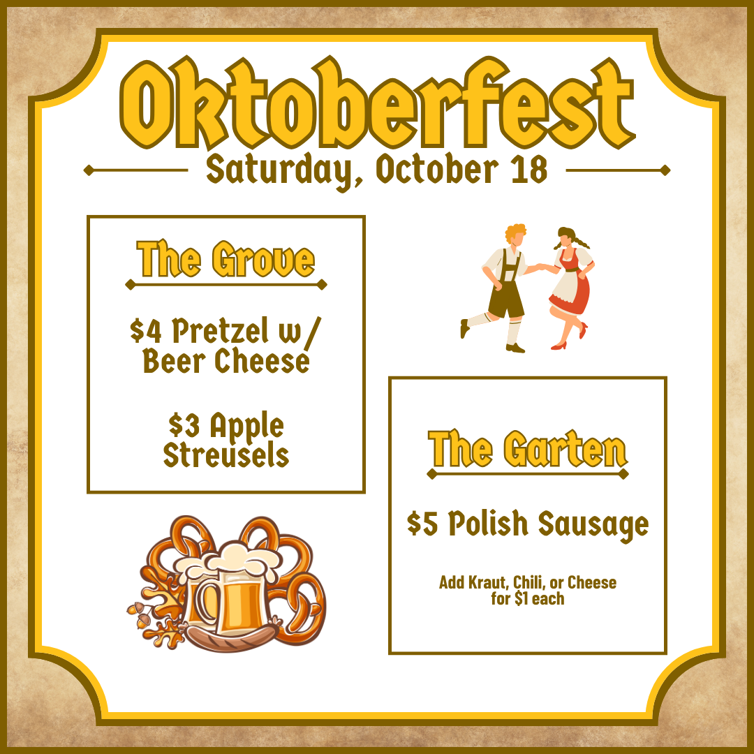 Join us on Saturday, October 18 to celebrate Oktoberfest with 3 different German-inspired food specials! We will be offering Pretzel, Streusel, & Polish Dog Specials on Saturday at the Garten & the Grove!